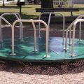 The 10 foot merry go round is the largest currently in production. This playground event can occupy several children at once. Merry go rounds offer an engaging activity children always enjoy. This merry go round has a governor to control speed. The platform is heavy 12 gauge steel with rolled edges. Hand rails are 1-5/8 inch powder coated pipe. Includes grease fittings for bearing and shaft lubrication. Popular standard colors are Red (base) and Yellow (hand rails) or Green (base) and Tan (hand rails). Each base is coated in thermoplastic (available in 2 colors: Green or Red) and the handrails are powder coat painted (available in a large selection).